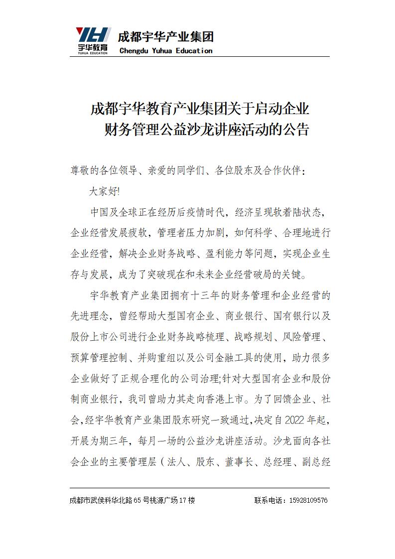 成都宇华教育产业集团关于启动企业财务管理公益沙龙讲座活动的公告