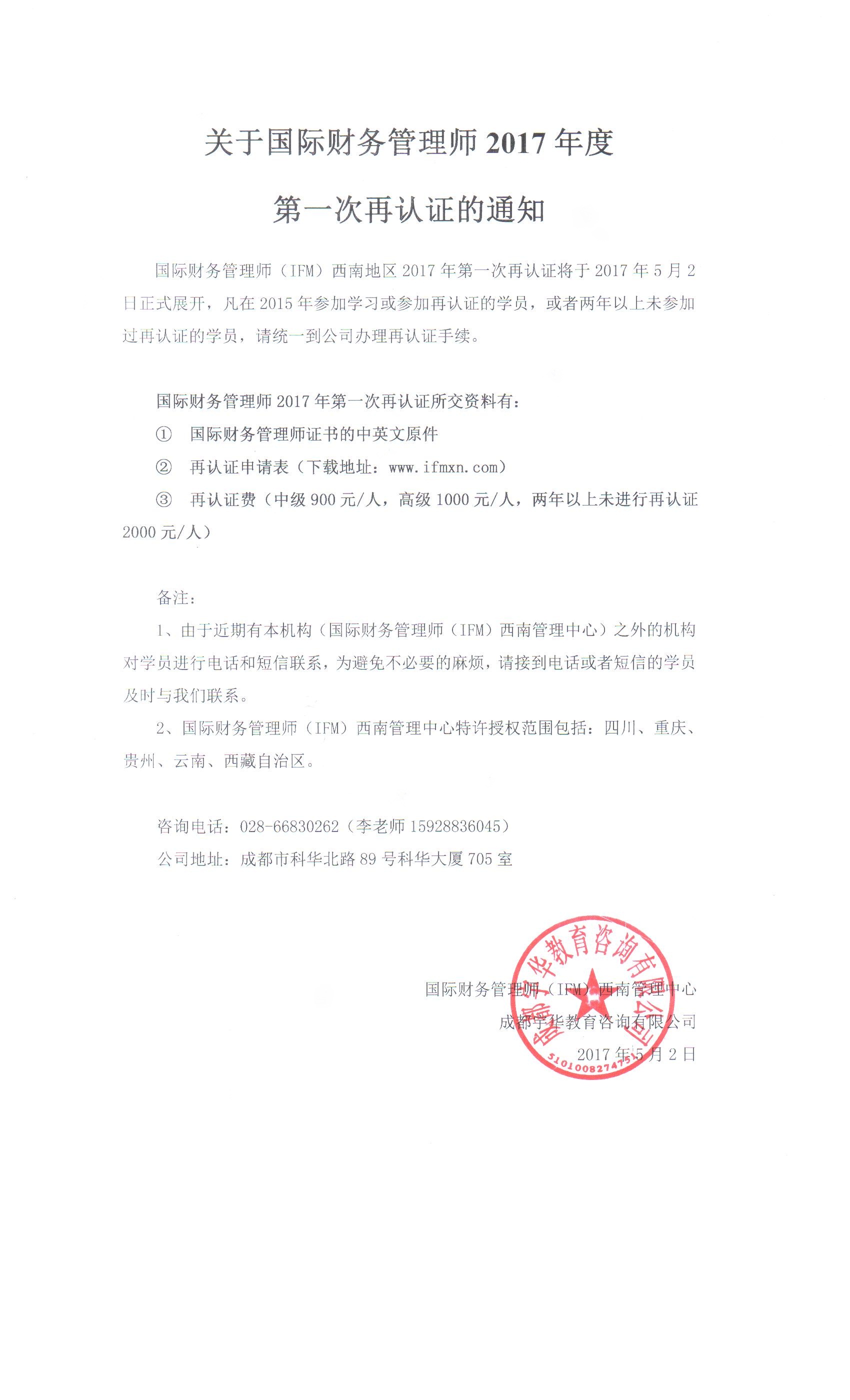 关于国际财务管理师(IFM)西南地区2025年度证书再认证的通知