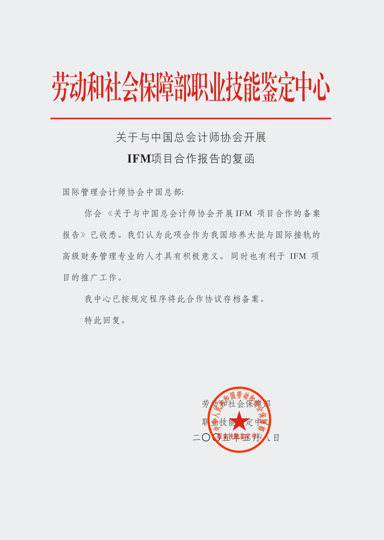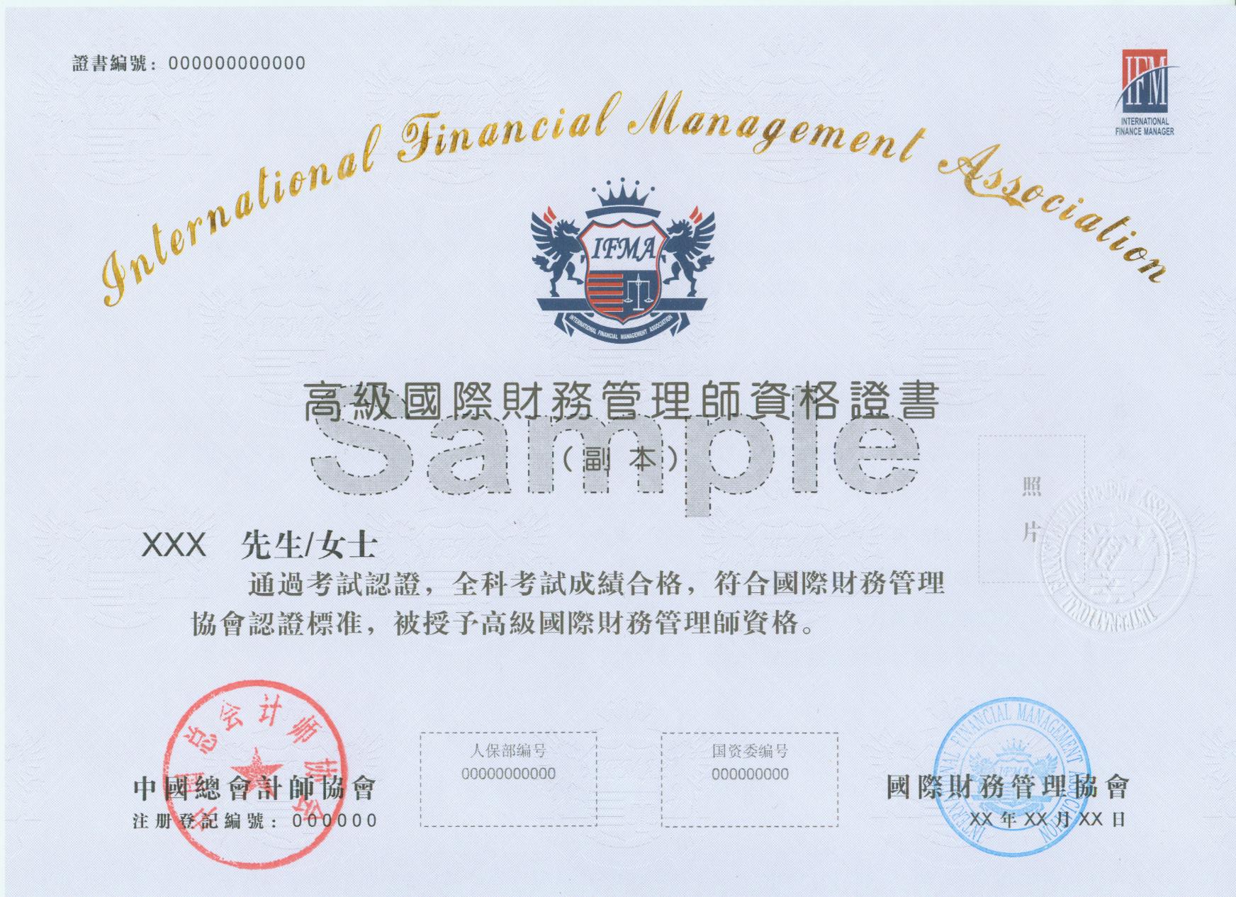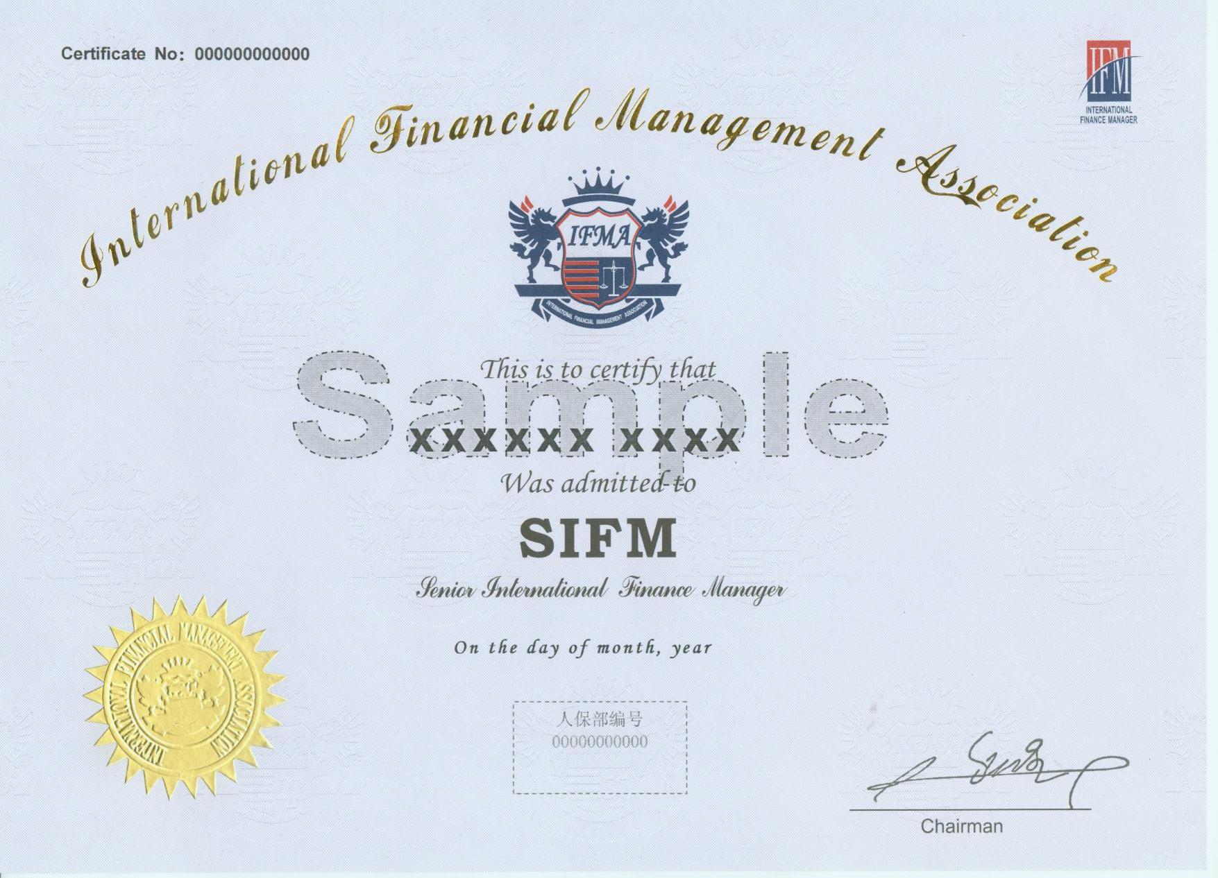申报SIFM级别合格学员获得由国际财务管理协会颁发,国家人力资源与社会保障部认证的《高级国际财务管理师》职业资格证书。申报IFM级别合格学员获得《中级国际财务管理师》职业资格证书。所获得证书可以在国家人力资源与社会保障部官方网址(WWW.OSTA.ORG.CN人社部)中查询证书真伪。