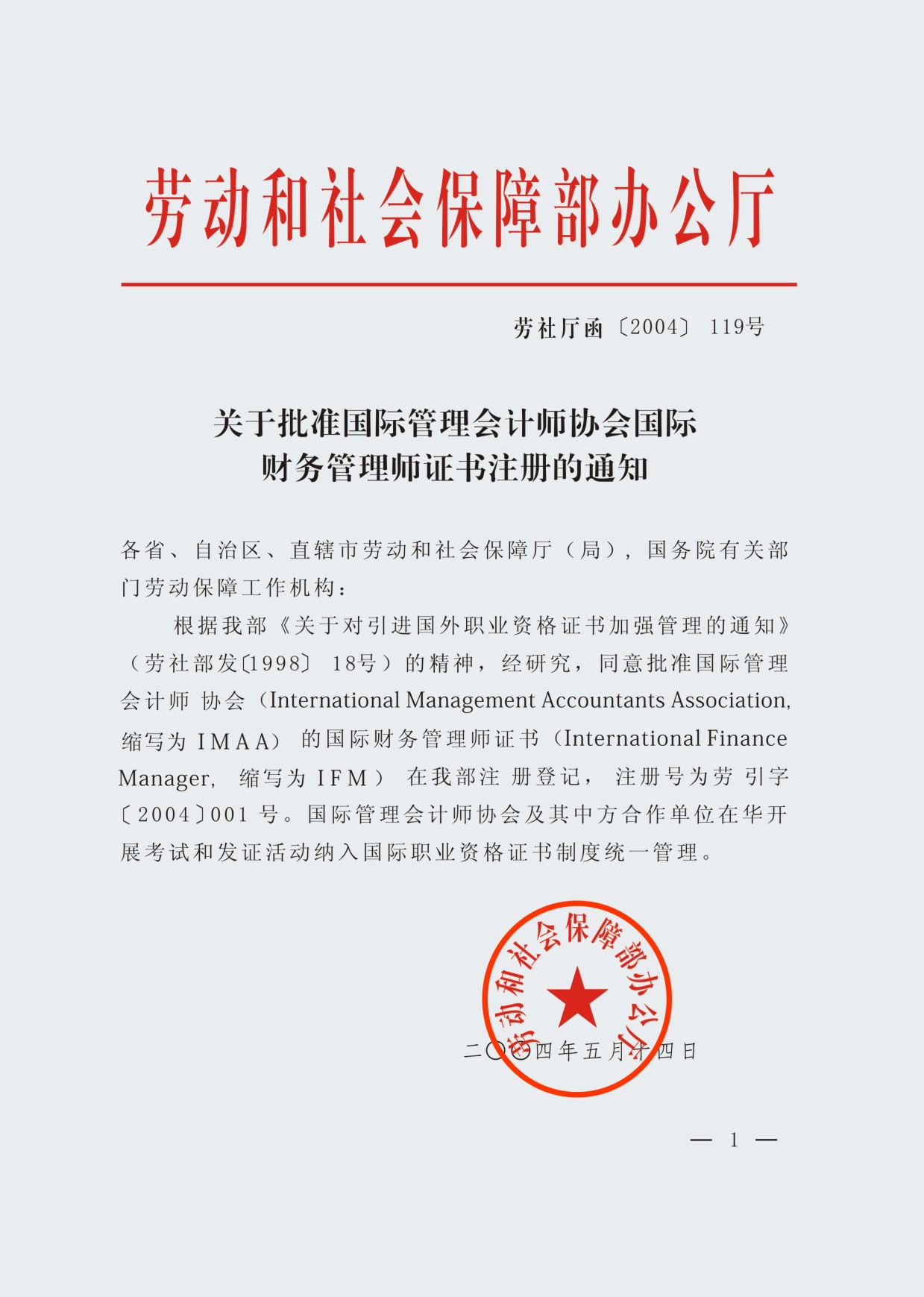 国家承认:国家人力资源和社会保障部(劳引字[2004]001号)